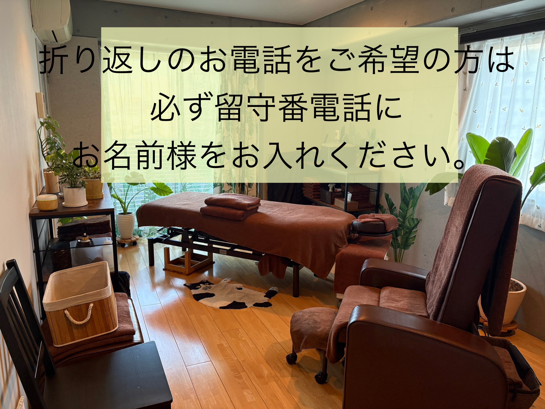 ※施術中は電話に出ることができないため、折り返しのご連絡とさせていただきます。留守番電話にお名前をお入れください。